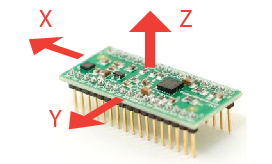 在使用整合了加速度计和陀螺仪的IMU设备时,首先要做的就是统一它们的坐标系。最简单的办法就是将加速度计作为参考坐标系。大多数的加速度计技术说明书都会指出对应于物理芯片或设备的XZY轴方向。例如,下面就是Acc Gyro板的说明书中给出的XYZ轴方向: